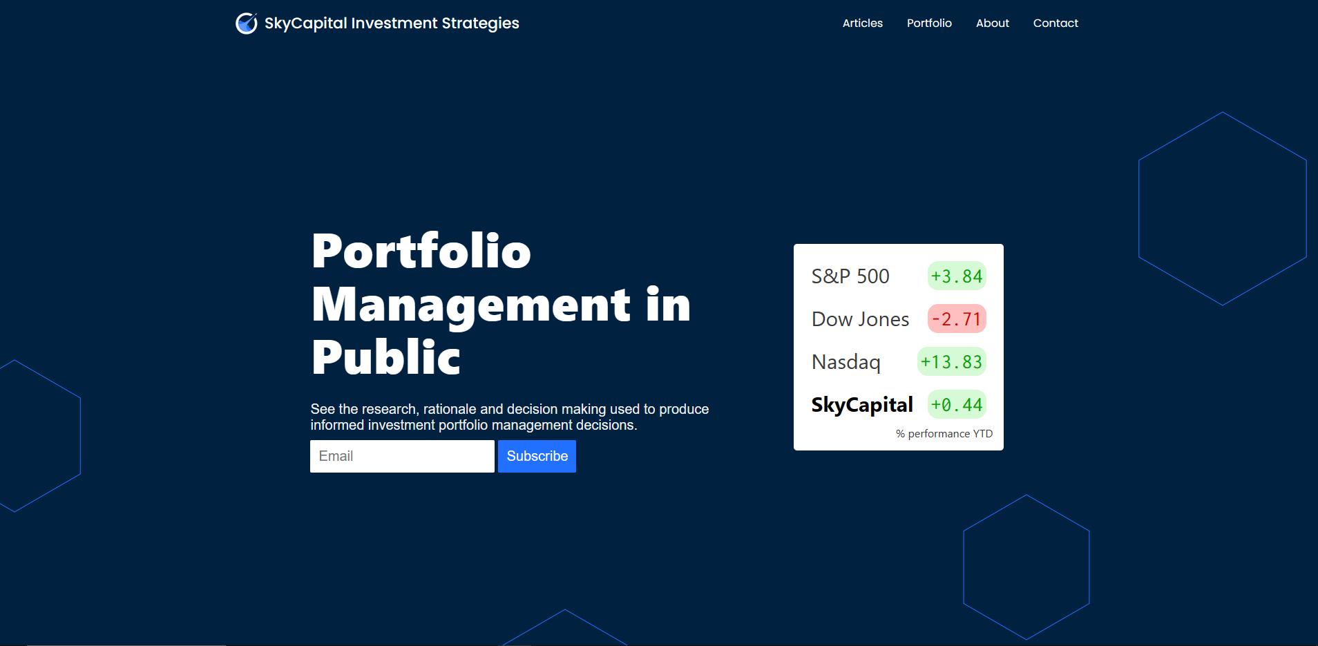This is a fullstack site where my friend and I publicly manage an investment portfolio. We write articles about our investment strategies and investment activity. The site offers an email subscription to notify users when new articles are published.